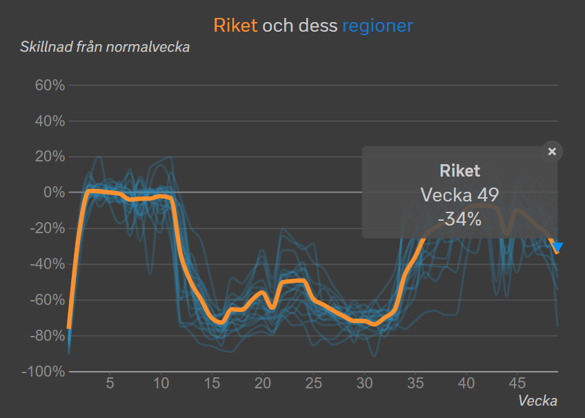 Trykket på sykehusene fører nå til at planlagte operasjoner må utsettes igjen. 1/3 planlagte operasjoner ble utsatt uke 49. Västerbotten er verst rammet med 75% innstilte operasjoner.