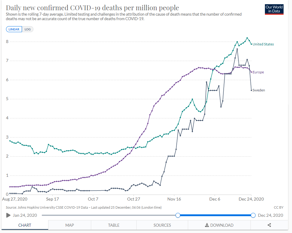 Etter smittetoppen i begynnelsen klarte Sverige seg ganske bra. I snitt lå Sverige under både Europa og USA når det kommer til antall døde per million innbygger.