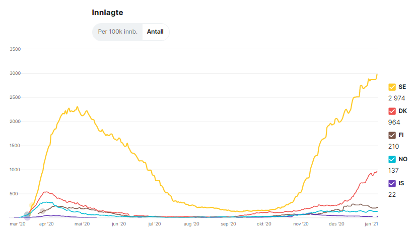 Sverige praktiserer jo relativt strenge tiltak som begrenser smitten mye, men innført litt sent slik at de sliter med å knekke kurven.
