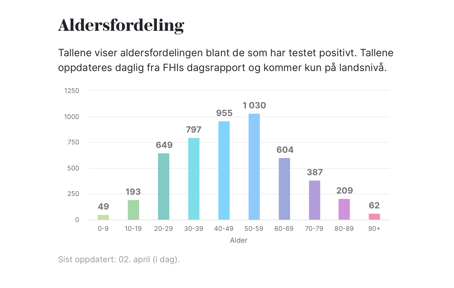 Interessant å se på alderssammensetningen på smittede i Norge… Grafikk VG, kilde FHI.