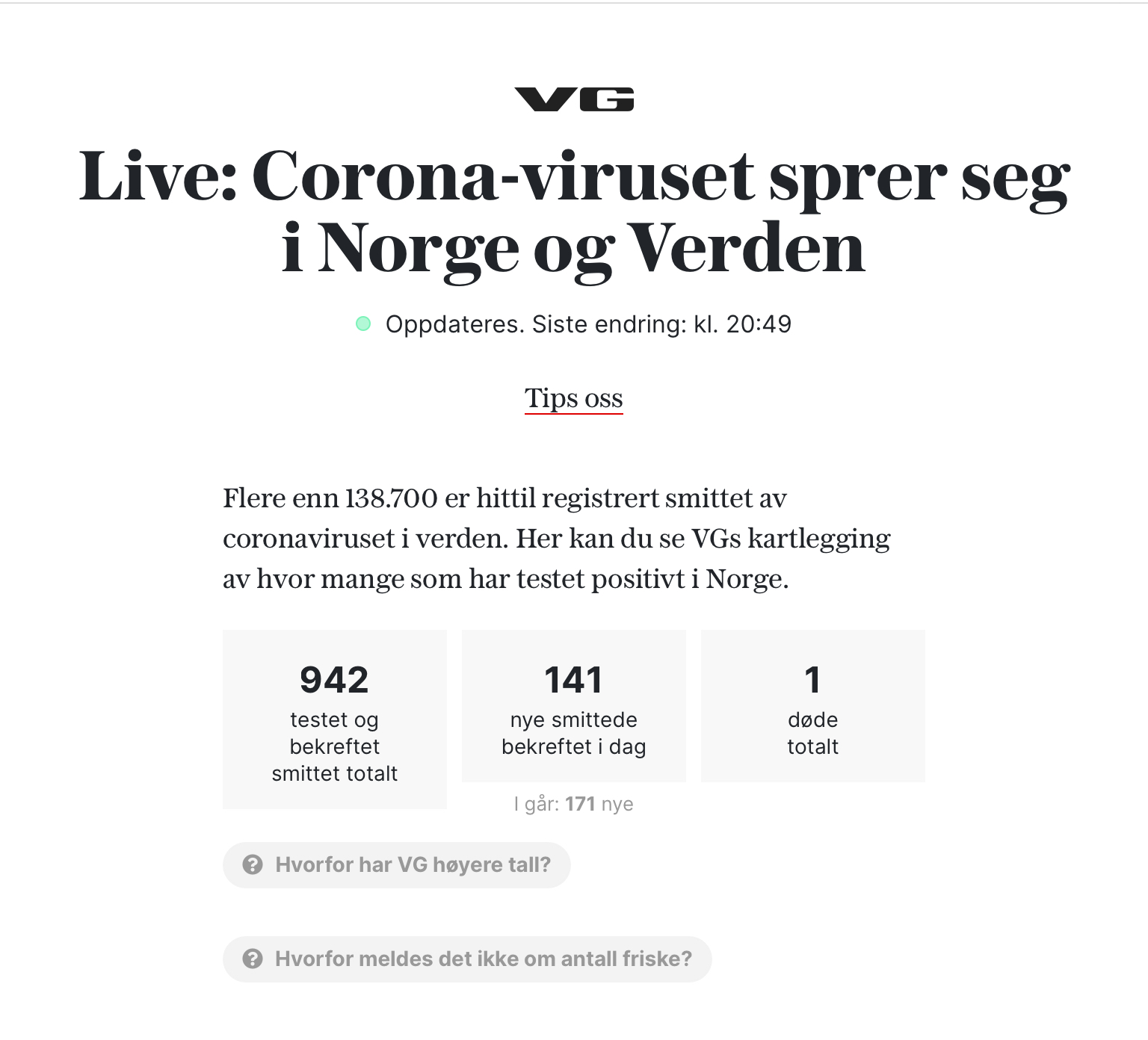 Takk til alle som deler nyttige ting i denne tråden. Er mitt første stopp hver morgen for å se hva som skjer med Corona. Tips gjerne venner og bekjente også om at det er verdt å følge med her