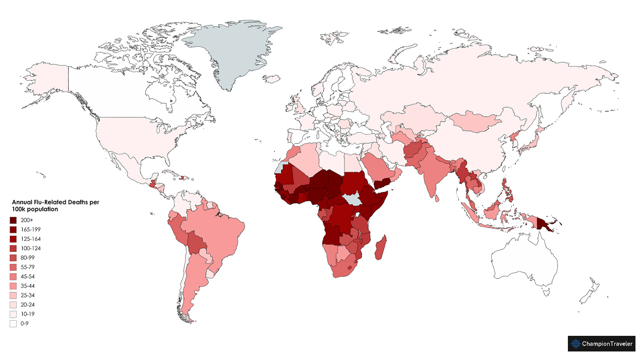 Vi er fortsatt veldig tidlig i forløpet av dette som en global pandemi, og det er fryktelig få som er testet foreløpig i disse landene, så det kan være store mørketall. Så vidt du vet trives ikke vanlig influensa i disse områdene, men her er hvor mange som faktisk dør pr. capita av vanlig influensa i disse områdene: