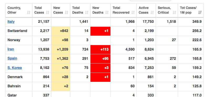 Utvikler seg kjapt i Sveits nå! Plutselig er vi ikke nr 2 lenger på lista. Ikke vært så mye snakk om Sveits enda men med også 14 dødsfall er det vel mye som tyder på at de har kommet et stykke lenger enn oss.