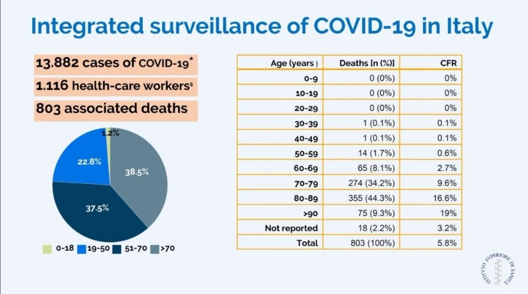 «Ifølge informasjon fra Det italienske helseinstituttet (ISS) er gjennomsnittsalderen for de som testet positivt i Italia for tiden rundt 81 år. 15% av de døde er over 90 år gamle. 90% av de døde er over 70 år gamle. «
