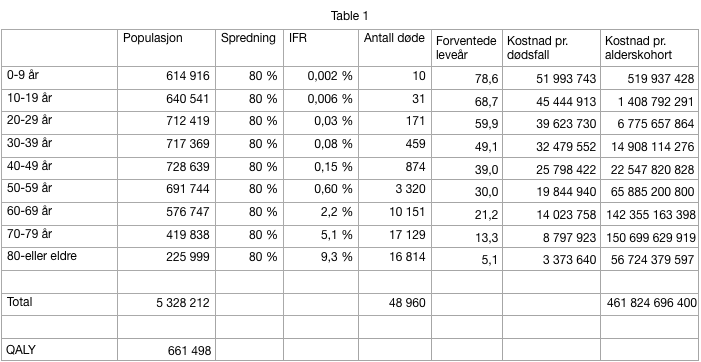 Det er flere som argumenterer for at Alternativkosten/QALY bør være lik BNP pr. innbygger. F.eks. her: https://tidsskriftet.no/2017/03/kommentar-og-debatt/ny-norsk-terskelverdi-verdien-av-et-godt-levear-0. I fjor var denne kr. 661.498,-. Og så ble forventet leveår regnet som 84 minus alder litt urettferdig for de eldre i den første tabellen, så jeg har oppdatert forventede leveår med faktisk forventede leveår for de forskjellige kohortene hentet fra SSB: