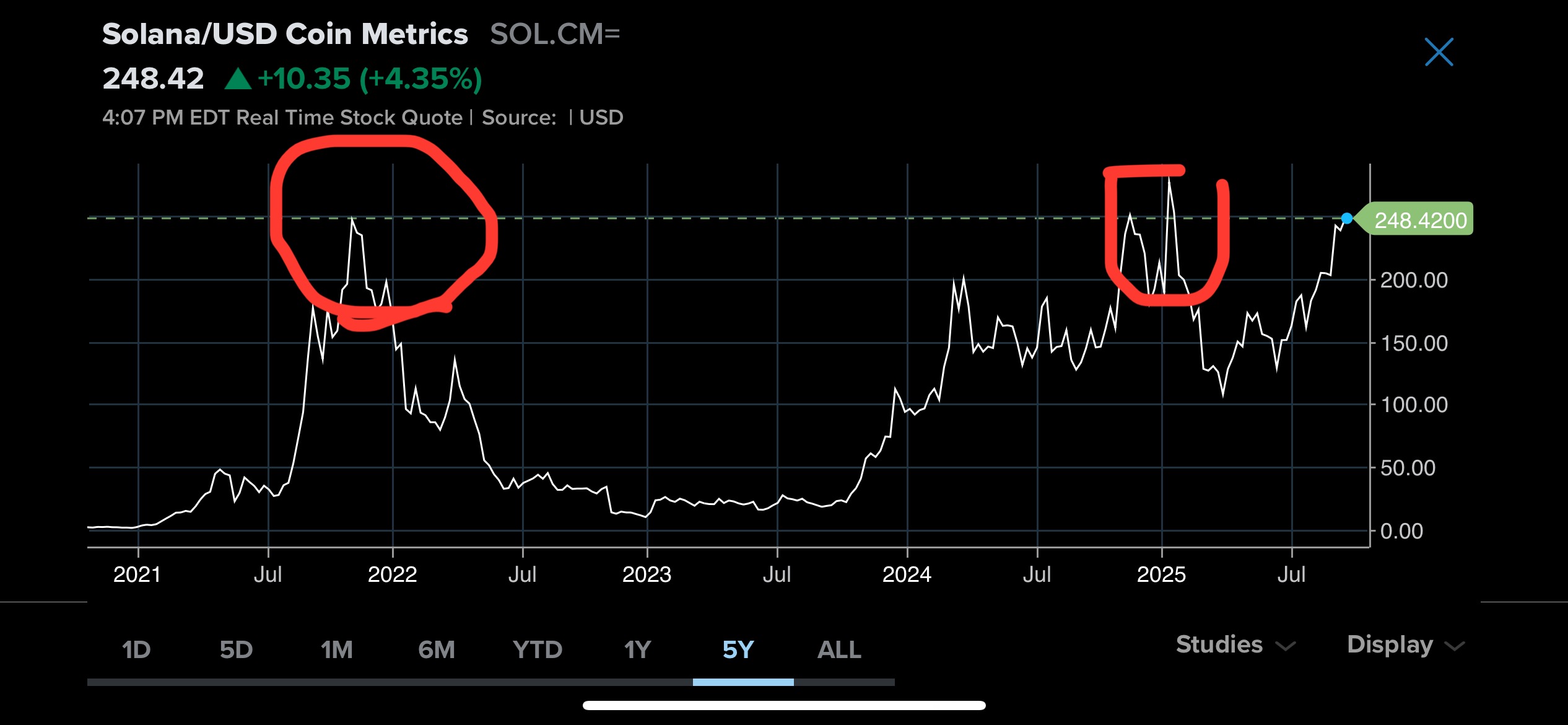 Spennende om SOL klarer å konsolidere rundt 250USD, for så å bryte videre opp