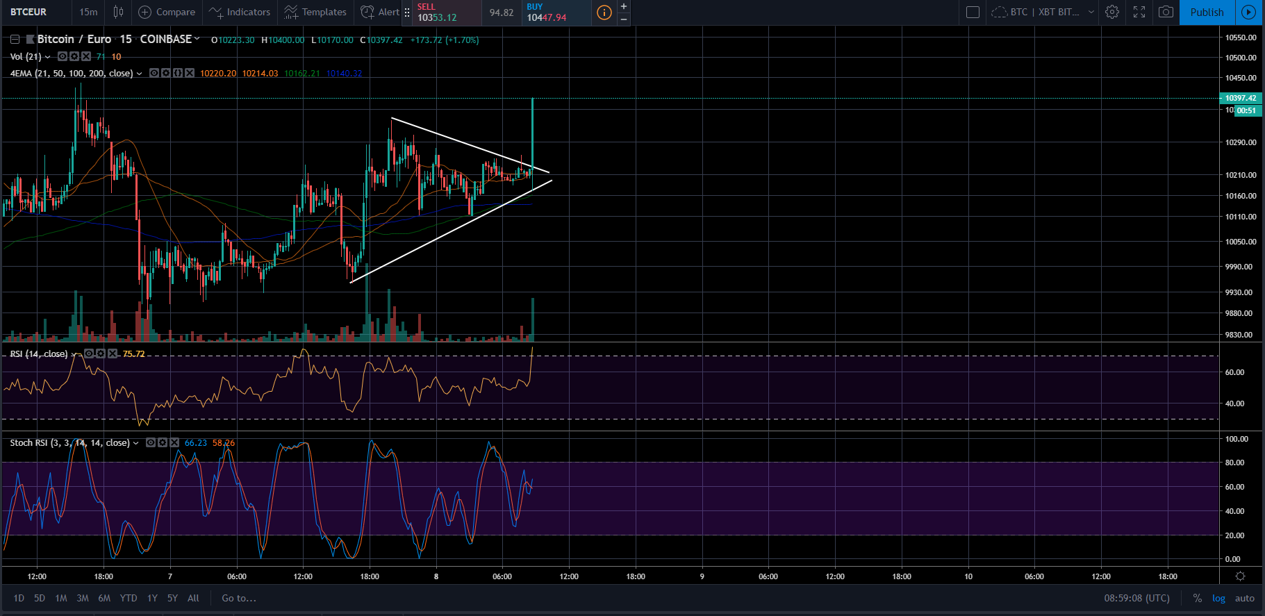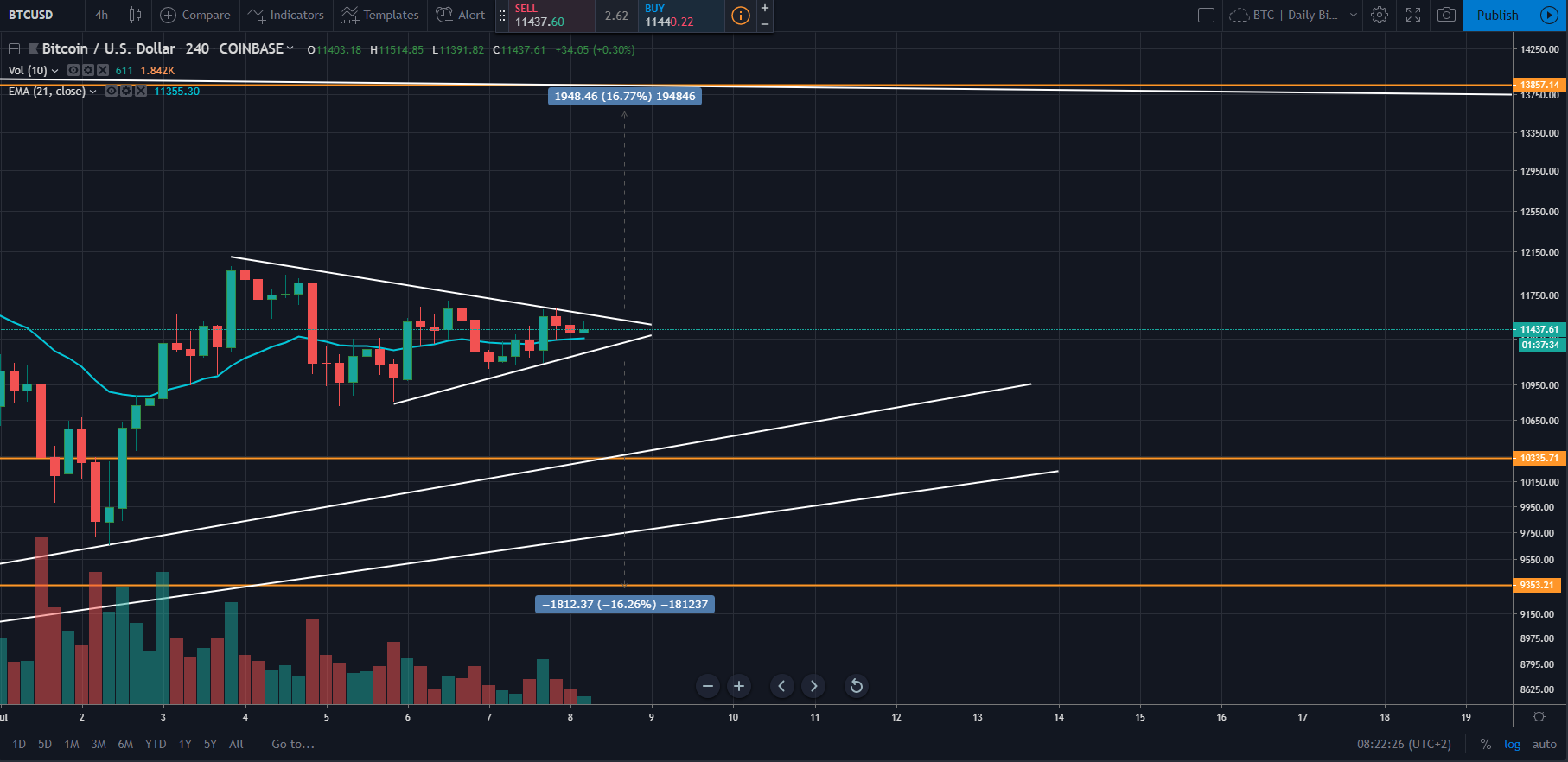 Ja, som sagt tror jeg det er helt Äpent, fÞlger bare med for bruddet kommer ila. dagen i dag (skal man tro pÄ chartet). Vil anta vi enten skal opp og teste motstand rundt $14k, eller at vi bryter ned mot bunn men lager en LL. HÄper ogsÄ den bryter opp, det er bedre r/r Ä shorte pÄ 14k (dobbeltopp) enn nÄ og risikere en kraftig candle mot 14k.