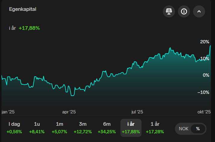 Ellers har jeg også solgt ut aksjer som Circio og Larkberget i år med negativ avkastning i år, så reell avkastning på ny strategi aksjene er faktisk enda høyere om en kunne tatt de bort fra totalen.