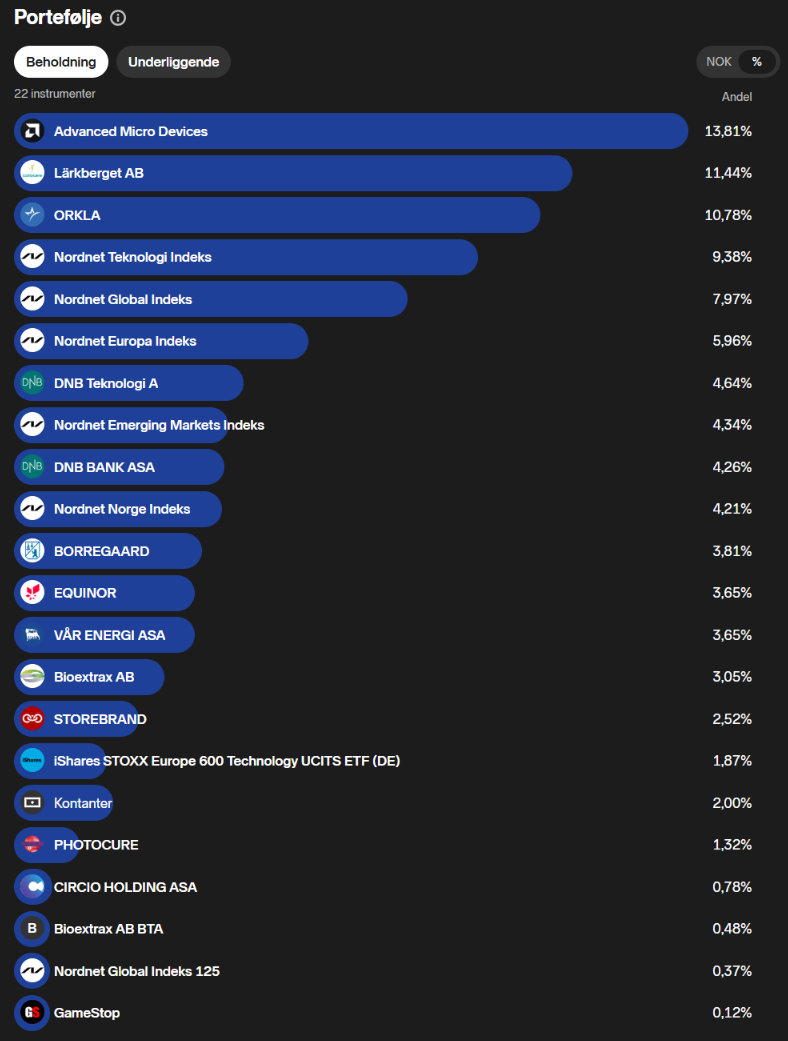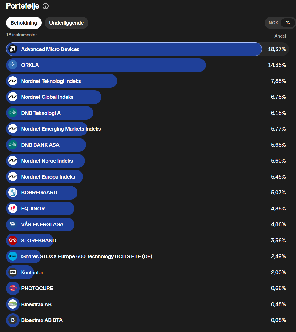 Som en ser så er det ganske mye fond det går i. Ellers i forhold til aksjer er hovedvekten på Orkla grunnet utbytte, samt AMD fordi det er selskapet jeg har mest tro på. Om det ikke hadde vært for nissen over dammen hadde jeg nok hatt enda mer penger i AMD, men slik ble det ikke.