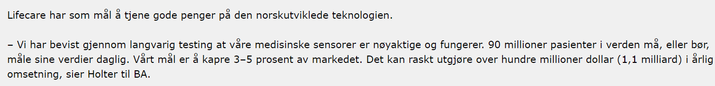 Lifecare AS is a clinical stage medical sensor company developing technology