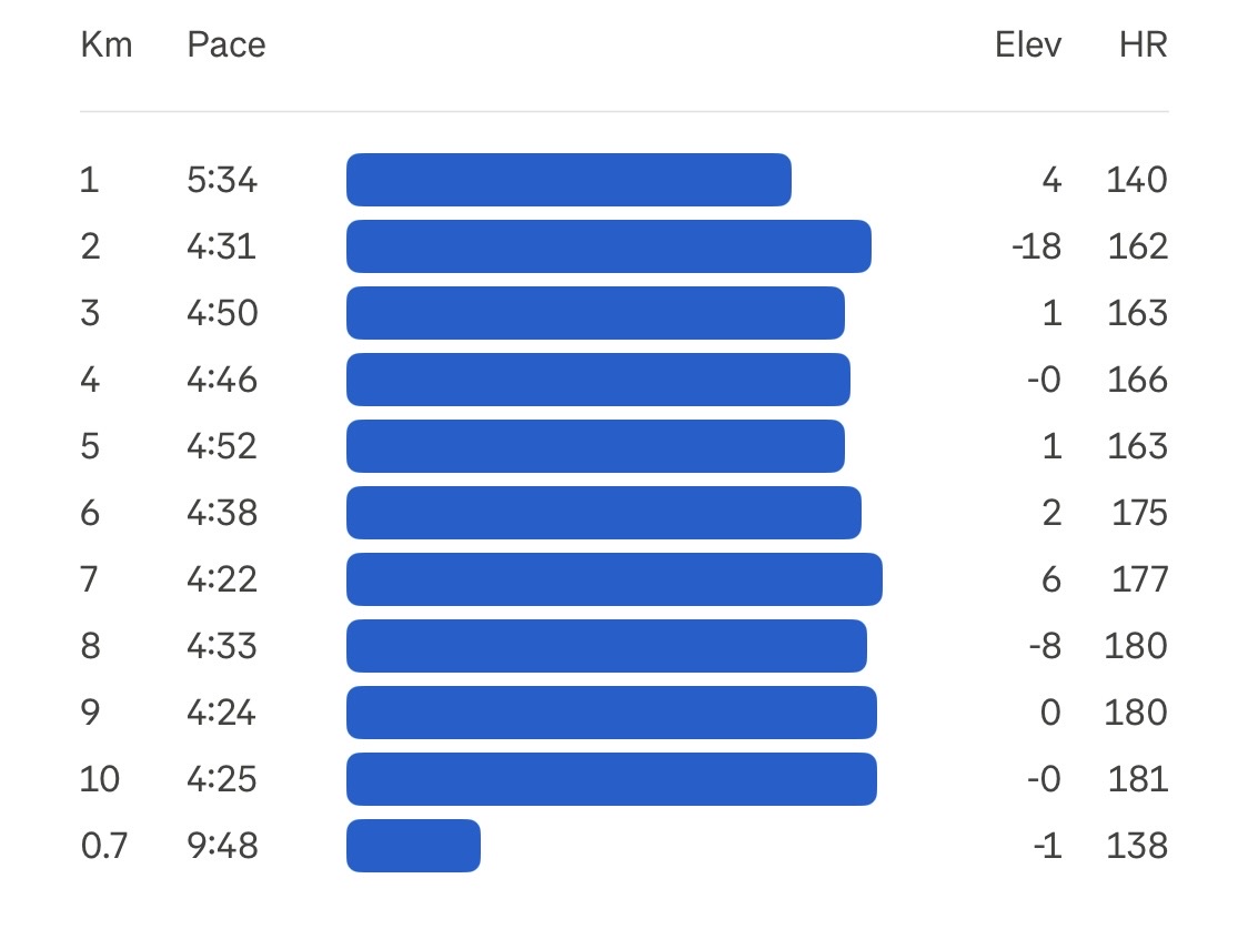 Har nesten omvendt cardiac drift med lavere puls og litt høyere hastighet mot slutten (om vi ser bort fra km 1-2 som er raske)