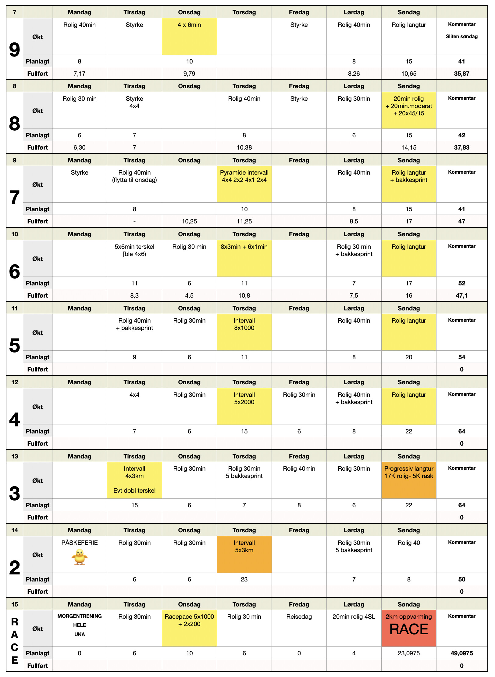 Har klart å følge det ganske greit men ser an dagsform og totalbelastning og gjør litt tilpasninger hele veien. Forrige uke ble litt mindre enn planlagt og de neste ukene blir spennende da det er disse som har mest økning, så jeg forhåpentligvis har noe å trappe ned fra den siste uka og kanskje få en bitteliten “toppform” på løpsdagen.