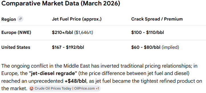 Det er flere områder hvor Europa får en mye høyere energi-kost en USA akkurat nå, feks drivstoff til luftfarten: