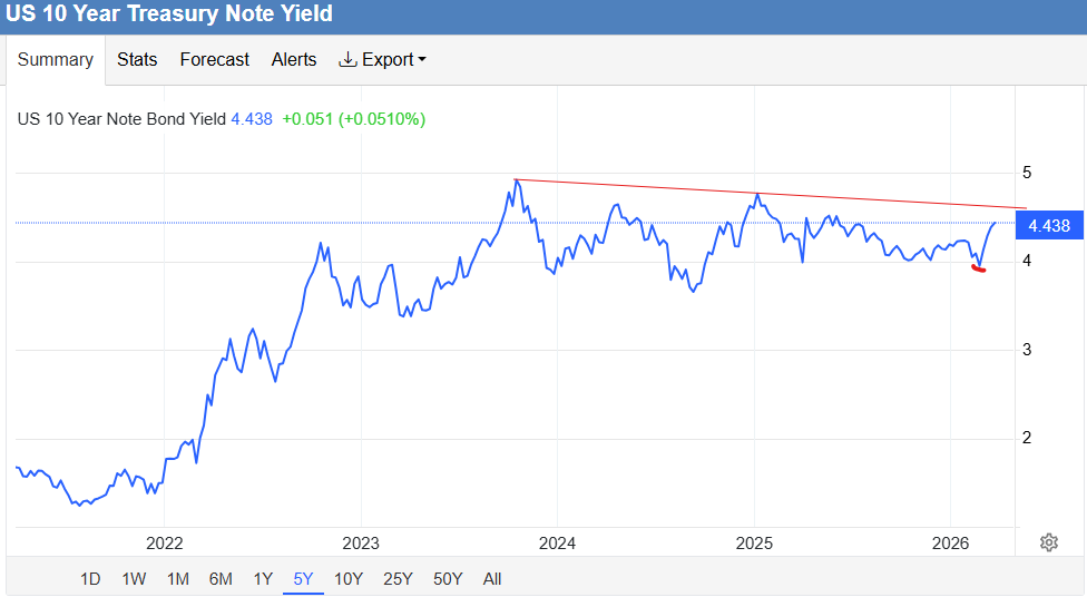 US 10 års renta har steget en god del i mars, faktisk nesten 0,5% fra rett før Iran-konflikten: