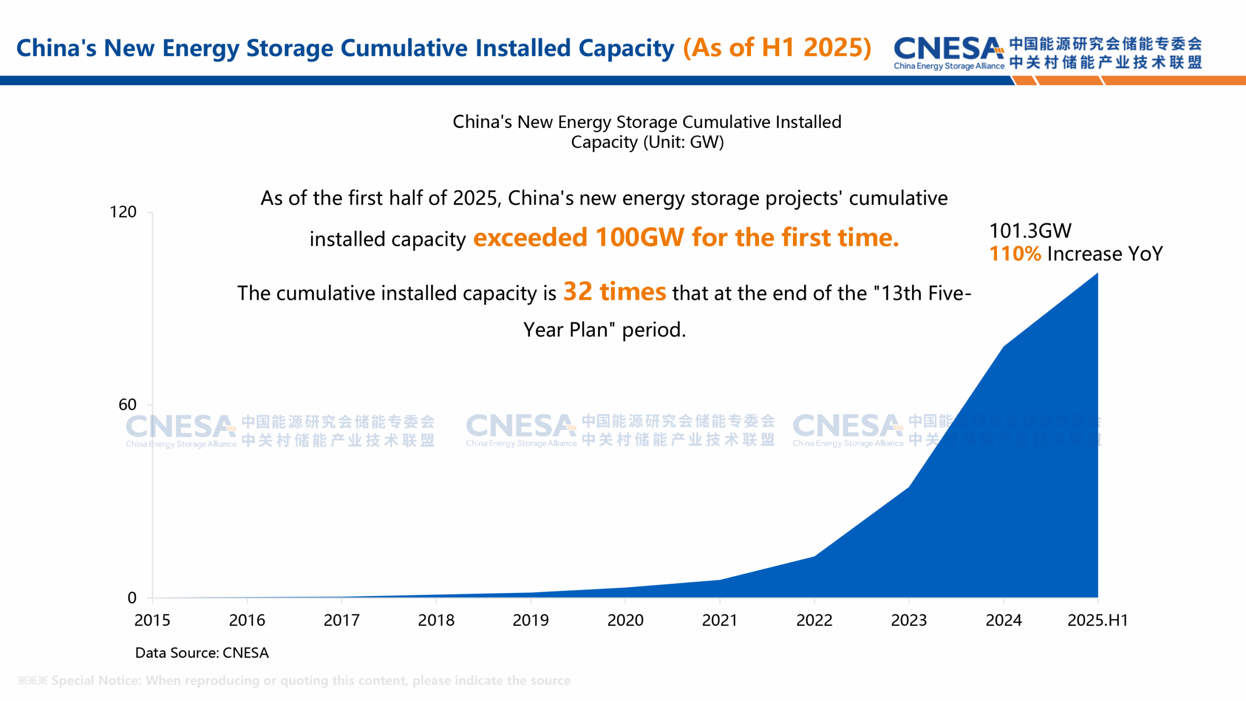 Installert energilagringskapasitet i Kina er opp 59 % siste år. For batterilagring alene er den opp 110 %, altså en helt klar satsning på denne teknologien i skrivende stund. Kina sto for 75 % av installert kapasitet i juli (grafen viser kun t.o.m.H1 2025). Den har nå passert kapasiteten for pumpekraftverk, i et land som også har verdens største pumpekraftverk. De ser for seg en vekstrate på 20 % per år frem til 2030.