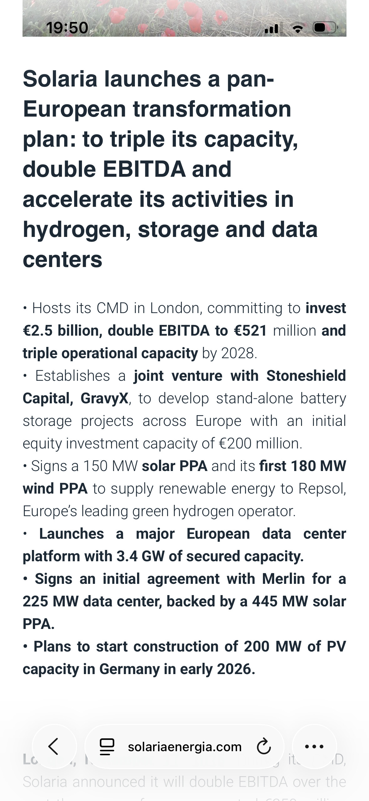 Arturo Díaz-Tejeiro , CEO of the company : ‘We are rigorously executing the plan presented at our Capital Markets Day. The progress made in storage and international expansion confirms that Solaria is no longer just a solar developer, but a European energy infrastructure platform ready for Europe’s new industrial and digital cycle.’