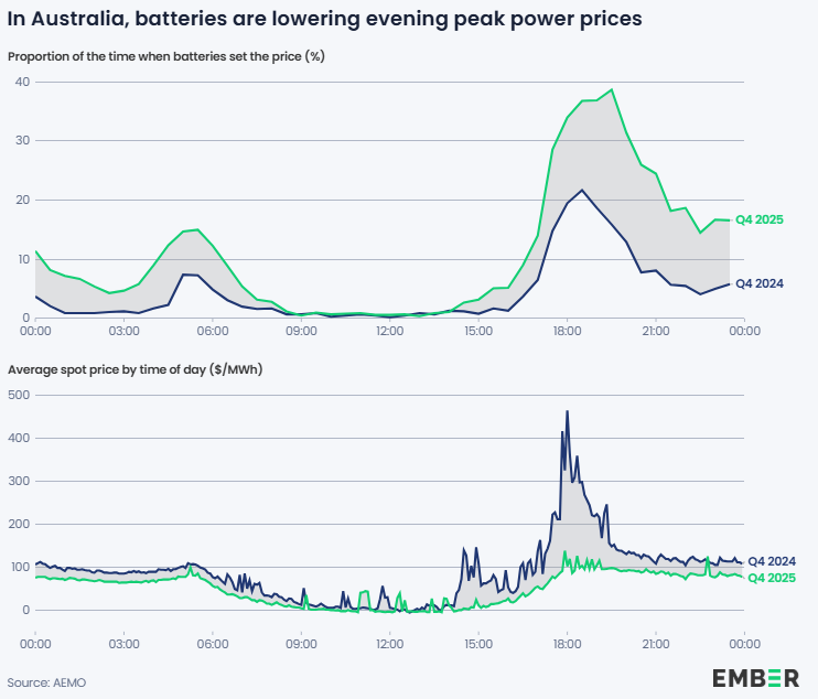 2025 har vært et gjennombruddsår for BESS og energilagring. Nå begynner vi etter hvert å se konkrete resultater. Veldig fin illustrasjon fra Embers rapport som viser effekten av lagring. Ved å høvle av litt på soltoppen og flytte den til middagstider kan man få en veldig gunstig effekt, både på pristopper og gjennomsnittspris, selv uten mange Wh lagringskapasitet. Australia er i førersetet (har selvsagt enormt med solrikt areal per innbygger) og viser hva som er mulig å få til.