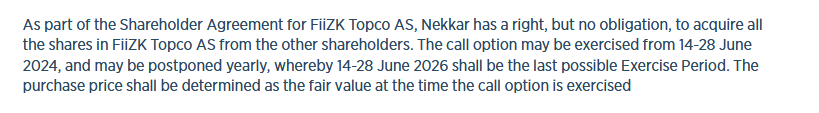 Som @theroger skrev, neste og siste mulighet for Nekkar å kjøpe de resterende 61%-ene av FiiZK er 14-28. juni 2026. Prisen blir “fair value” ved kjøpstidspunktet.