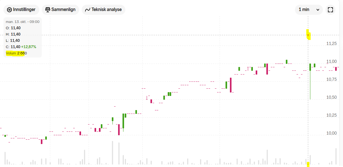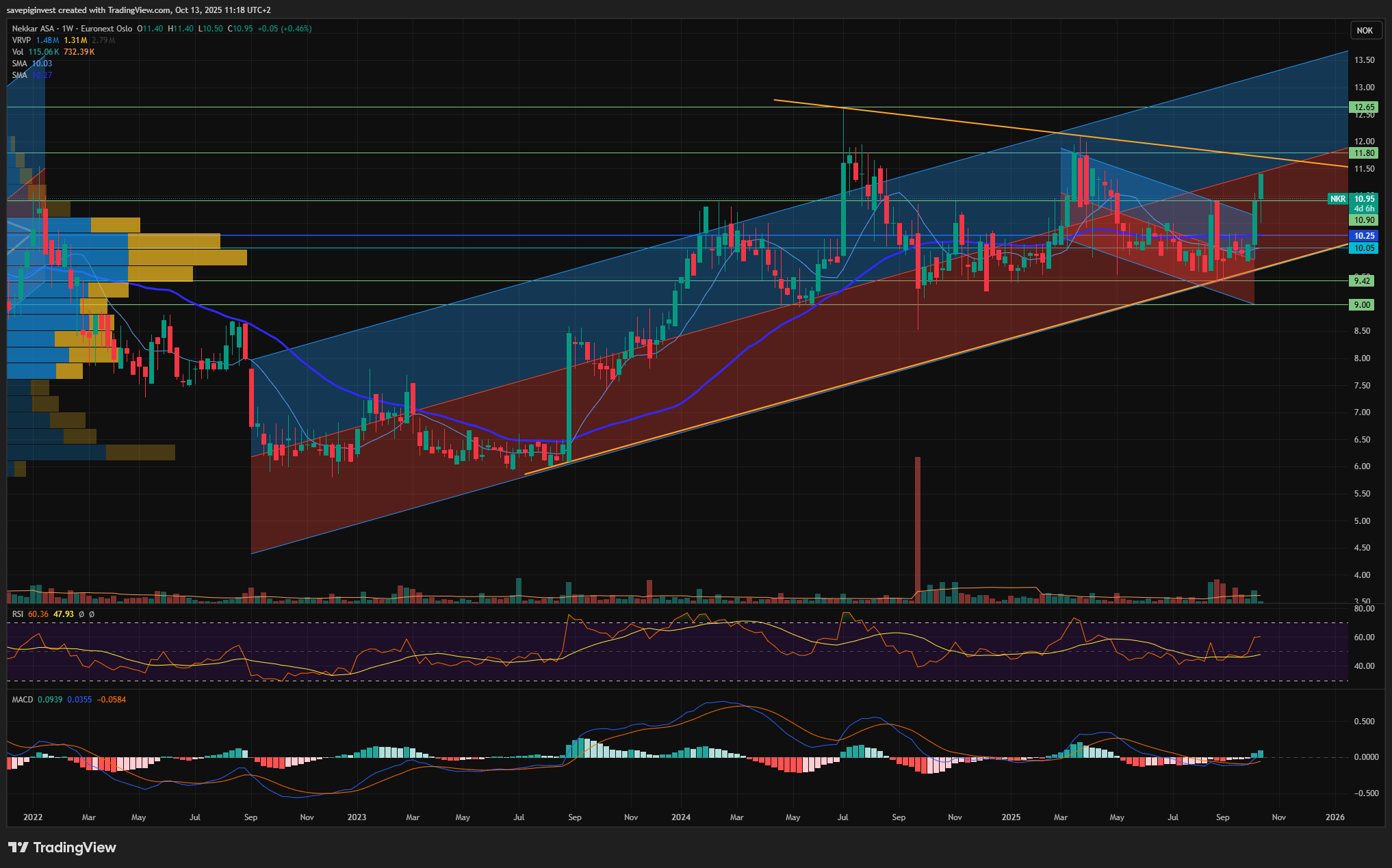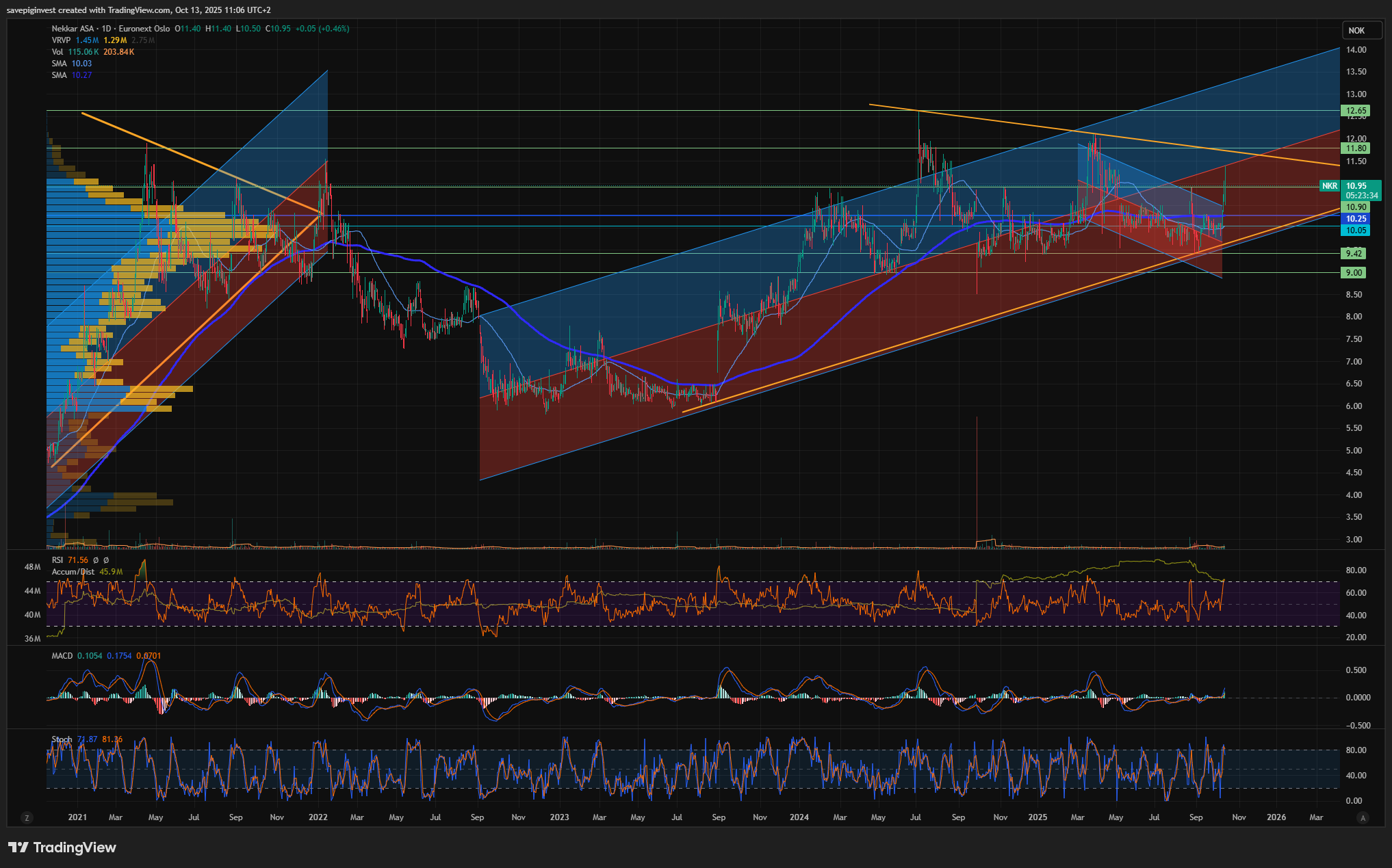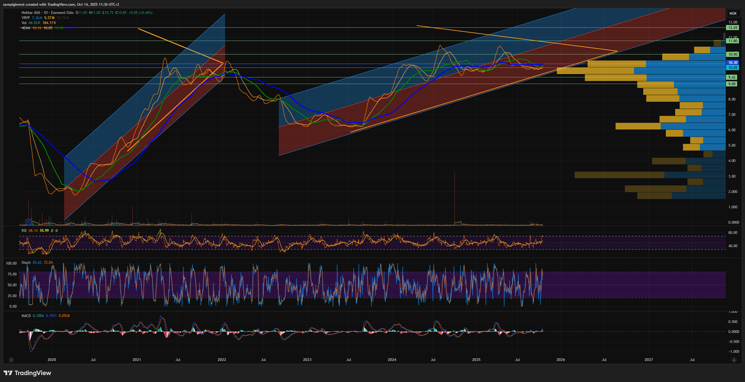 Min subjektive take, med all referanse til at jeg har en del aksjer her: Om det ikke kommer noen veldig rykk til nedsiden i løpet av Q4. så er det fort lett å finne veien videre opp for denne aksjen, ihvertfall om man får et rykk over 11-12 med bra volum.