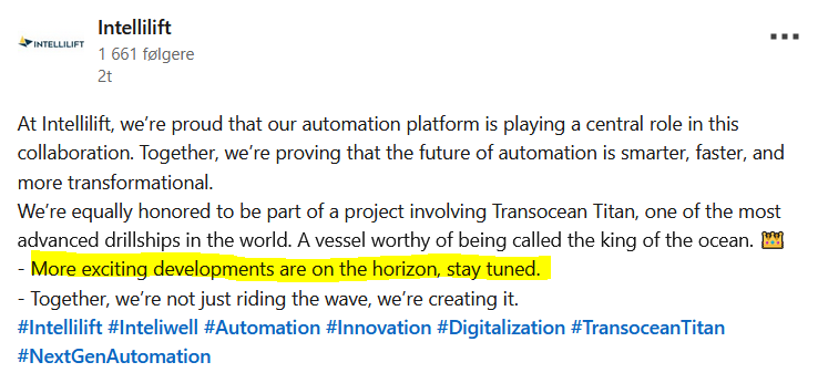 De har jo helt rett, Intellilift har jo laget sitt eget marked her. Det her er automasjon som ikke har fantes før såvidt jeg vet.