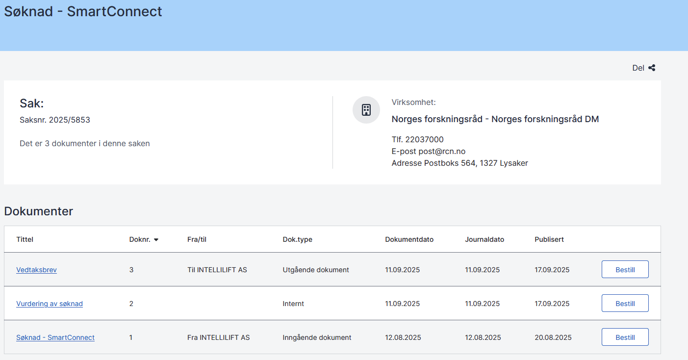 Ellers antar jeg at Vedtaksbrevet fra forskningsrådet gjelder bevilgning/avslag på søknad om midler til Intellilift sin SmartConnect løsning.