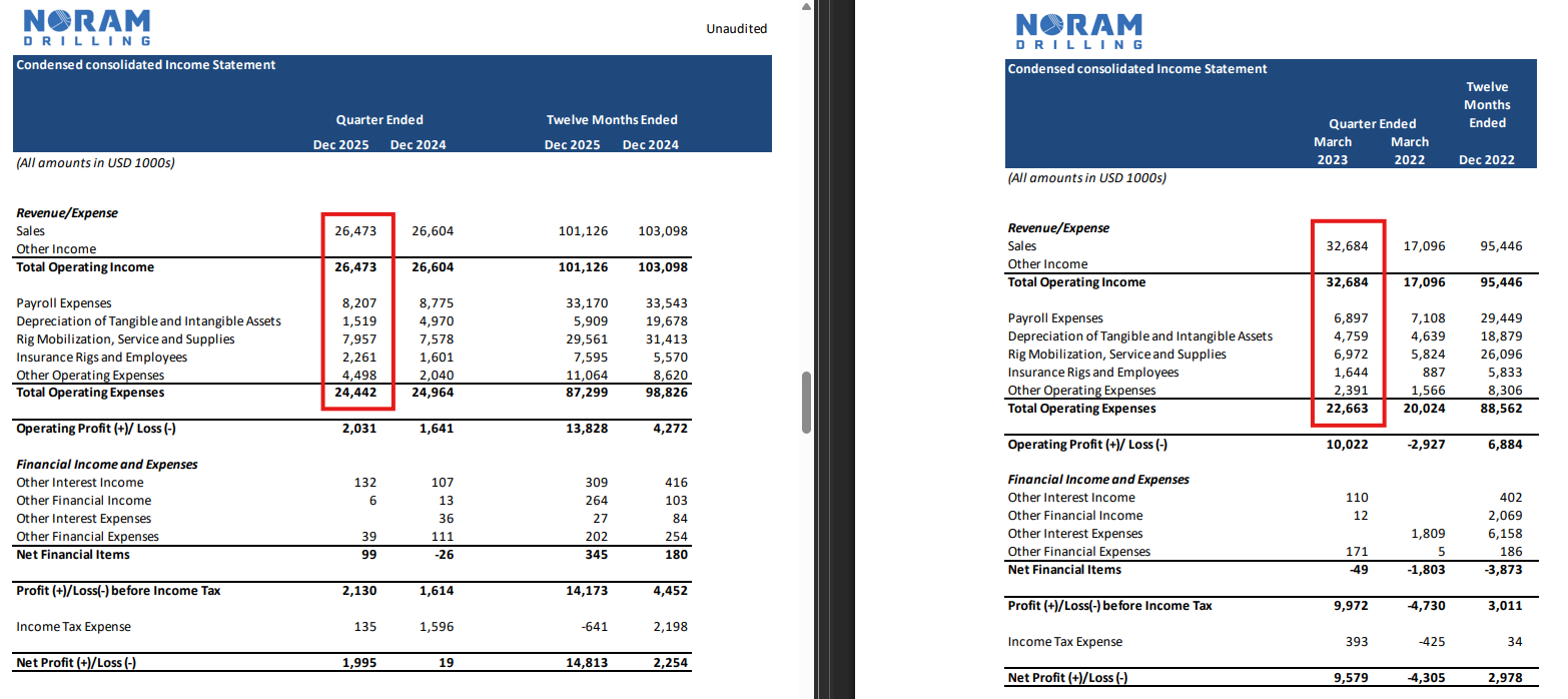 Fra q1 2023 da de hadde 11 rigger i arbeid, var revenue på 32,7 mill. Nå siste q var revenue på 26,5 mill med 9 rigger i arbeid.