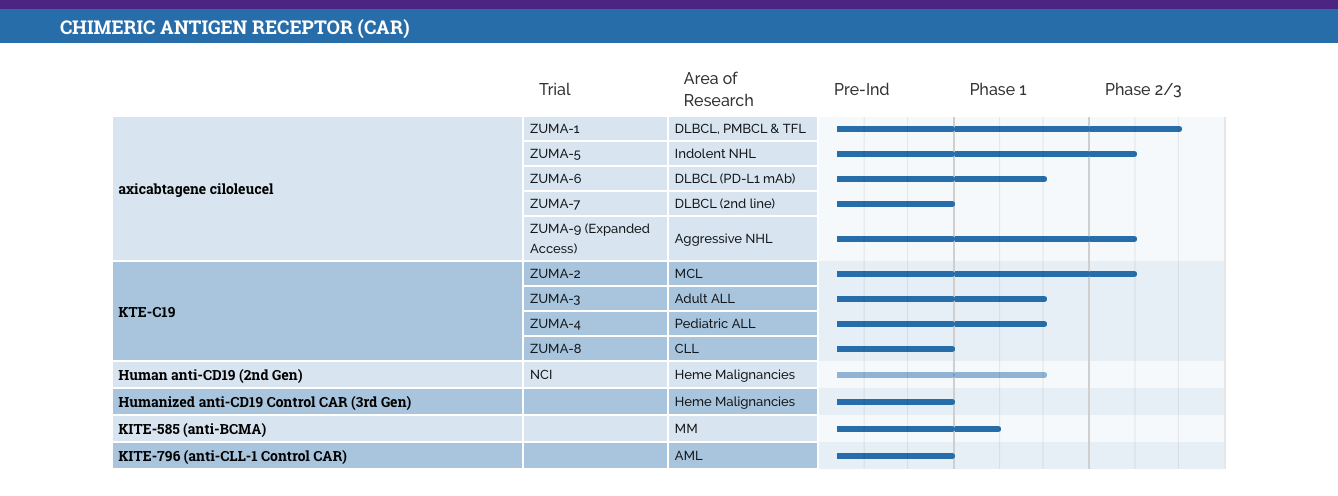 The Phase 2 ZUMA-5 trial aims to enroll 50 adult patients with iNHL whose disease relapsed within two years of first-line treatment, is refractory to second-line or greater therapy, or has relapsed at any point after transplant. The trial will determine patients’ response to treatment with axi-cel and assess if the therapy is safe. The primary endpoint will evaluate patients’ objective response rate, with researchers targeting a rate of 70%.