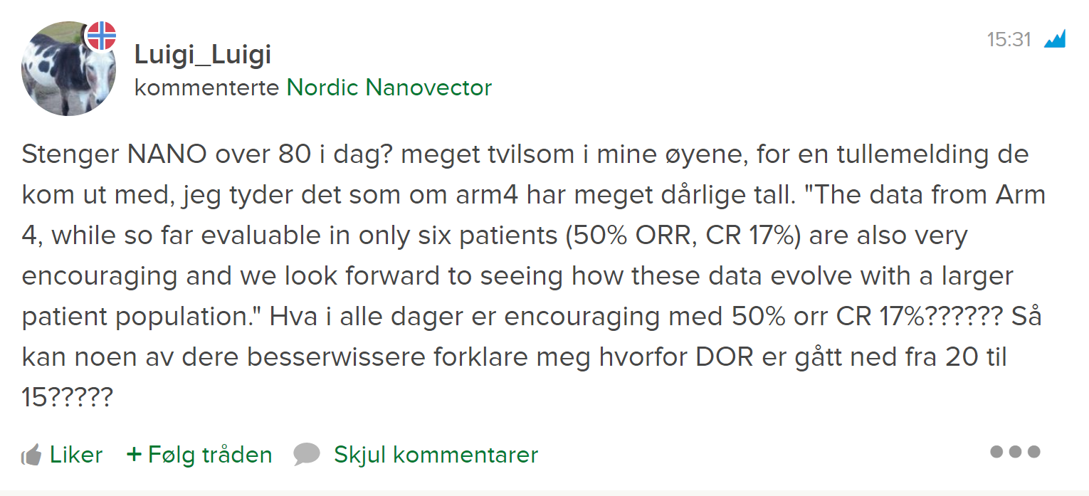 Min tro på selskapet er noe styrket etter de lovende dataene for 15/40, men skjønner veldig godt skuffelsen og frustrasjonen hos mange aksjonærer.