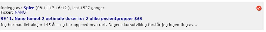Har tatt på meg pessimisttrusa i dag. @Nocturne jeg begynner å miste troa på respons fra markedet knyttet til BTD, paradigmeoppstart, doseresultater eller oppstart nye studier. 1. Jan 2018 kurs 75.45.