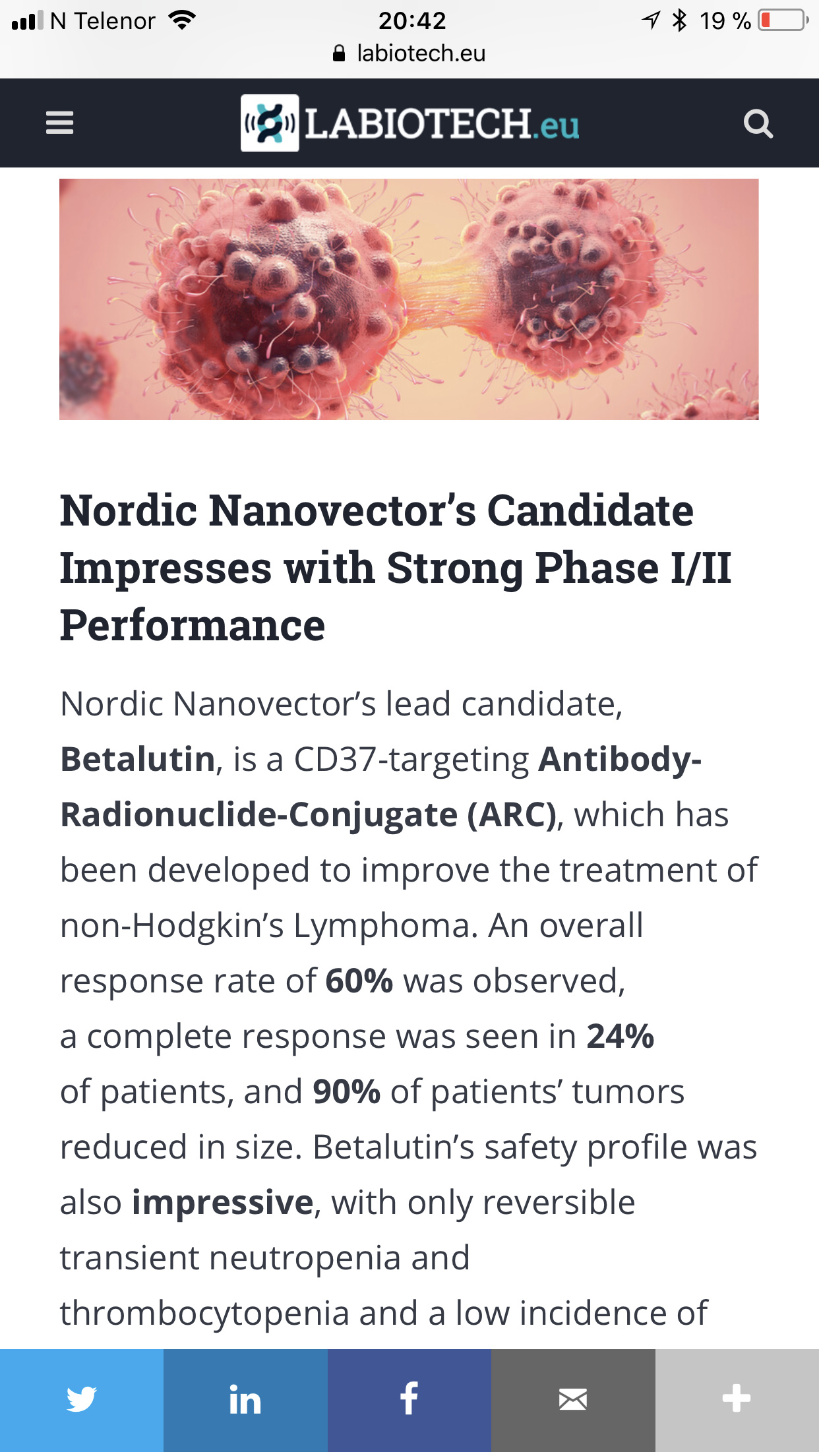Nordic Nanovector’s lead candidate, Betalutin, is a CD37-targeting Antibody-Radionuclide-Conjugate (ARC), which has been developed to improve the treatment of non-Hodgkin’s Lymphoma. An overall response rate of 60% was observed, a complete response was seen in 24% of patients, and 90% of patients’ tumors reduced in size. Betalutin’s safety profile was also impressive, with only reversible transient neutropenia and thrombocytopenia and a low incidence of infections observed.”