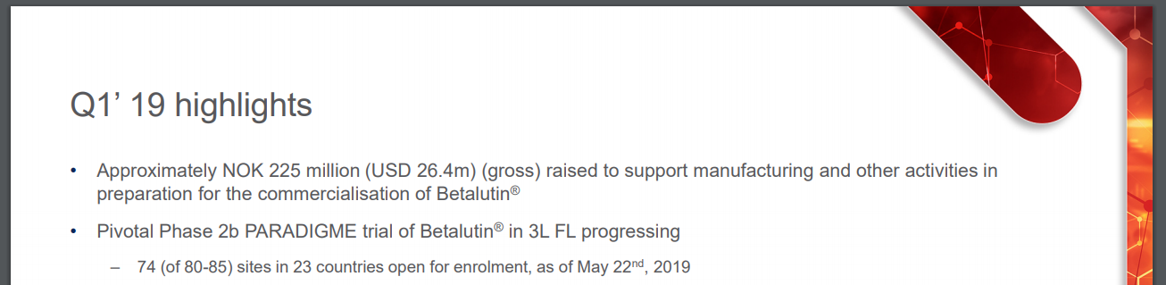 Man estimerer selve studien ferdig (study completed) 28. august 2020, altså glipper første halvår 2020 allerede der, og dermed også timing for refinansiering av dagens kasse. Men listen over feilende lokasjoner er så omfattende at det nødvendigvis vil måtte gi videre forsinkelser: Det er helt urealistisk å anta at med så store påløpte rekrutteringssvikter hittil, så vil resten forløpe etter plan.