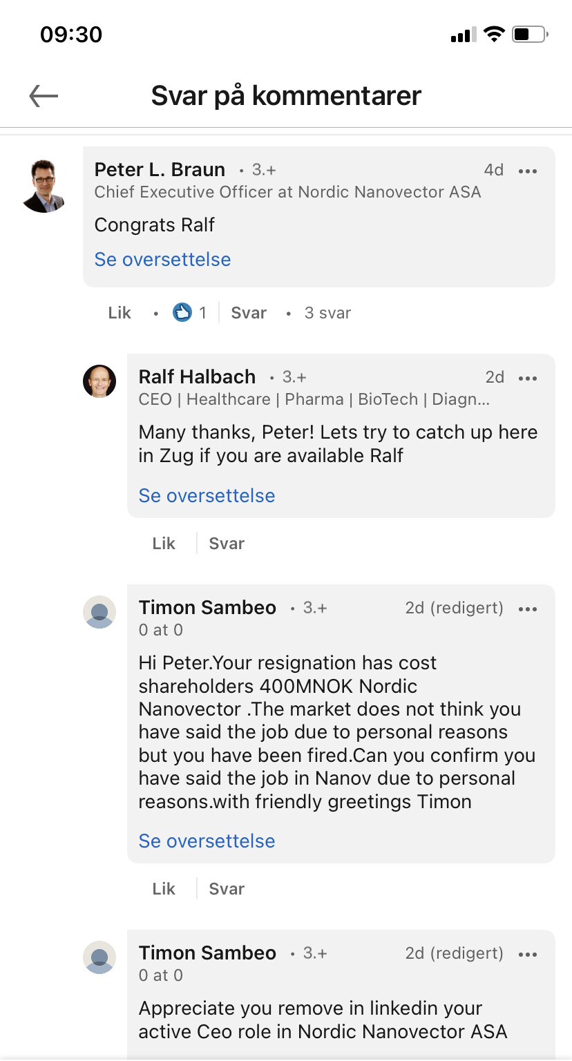 Enig. Han ber jo om en bekreftelse. Vurderer sannsynligheten for at Braun skulle si noe som helst om det i kommentarfeltet på sin egen LinkedIn-profil til NULL. Rett og slett flaut…
