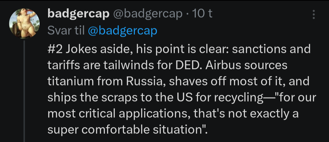 Det viktigste budskapet fra Airbus sin presentasjon er at Airbus er fornøyd og vil at NTI skal lykkes. Ordrene kommer. https://x.com/badgercap/status/1902550417680355789