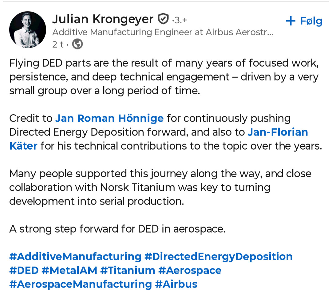 En børsmelding på mandag vil rydde alt. Kommer den ikke er dette i alle fall fortsatt første gang vi ser “serial production” “large” strukturelle w DED deler og ikke minst Airbus og NTI koblet så eksplisitt offentlig.