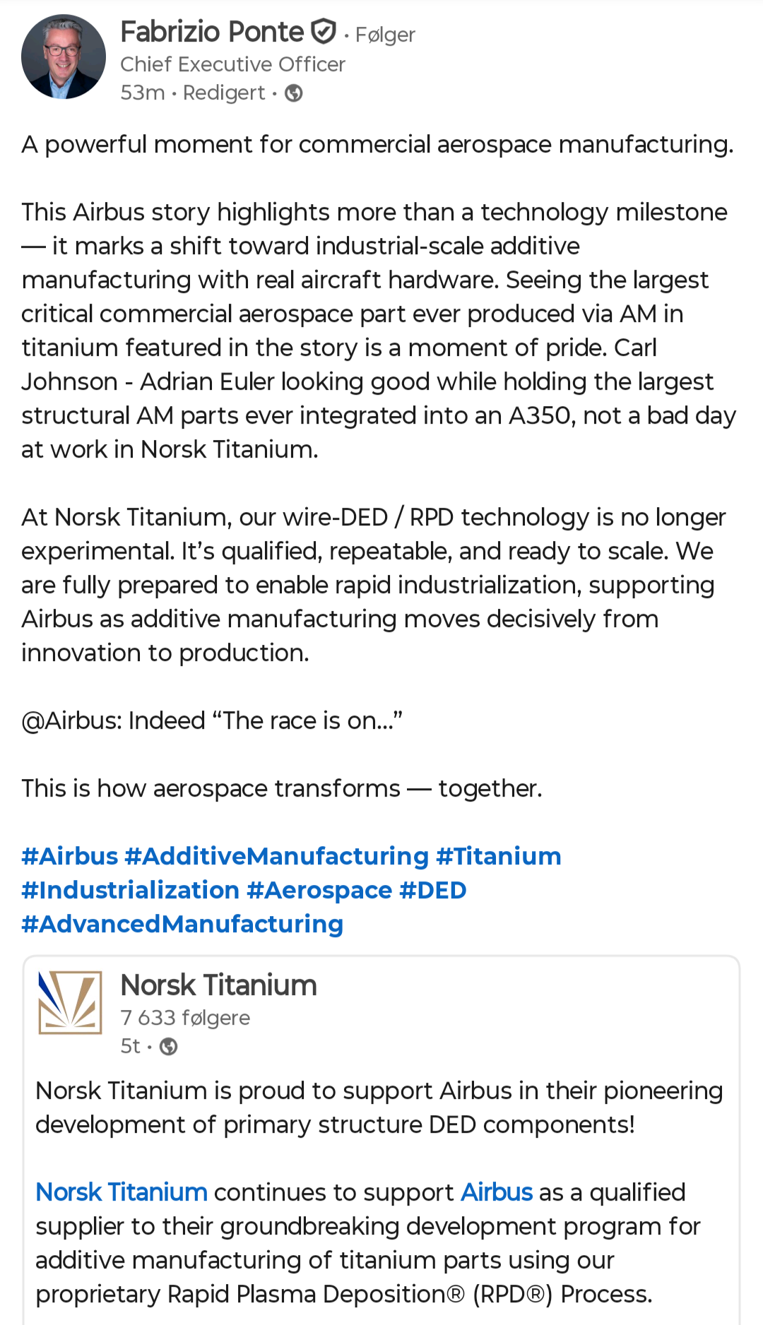 Må jo være relativt tunge deler som kvalifiserer for wave 3 definisjonen? Airbus has recently started serial integration of largest w-DED parts into the A350’s Cargo Door Surround area.