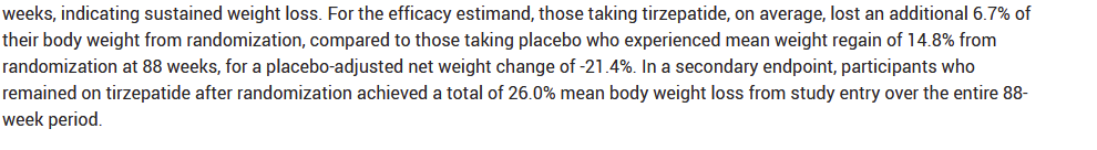Nå kan det være jeg også roter med treatment estimand / efficacy estimand og muligens blander epler og pærer, men her er hva Lilly presenterte i 2023 fra SURMOUNT-4