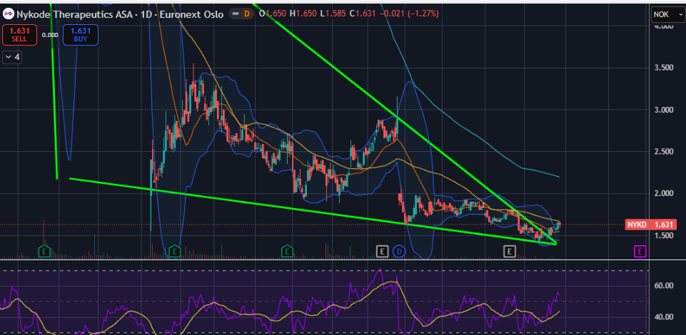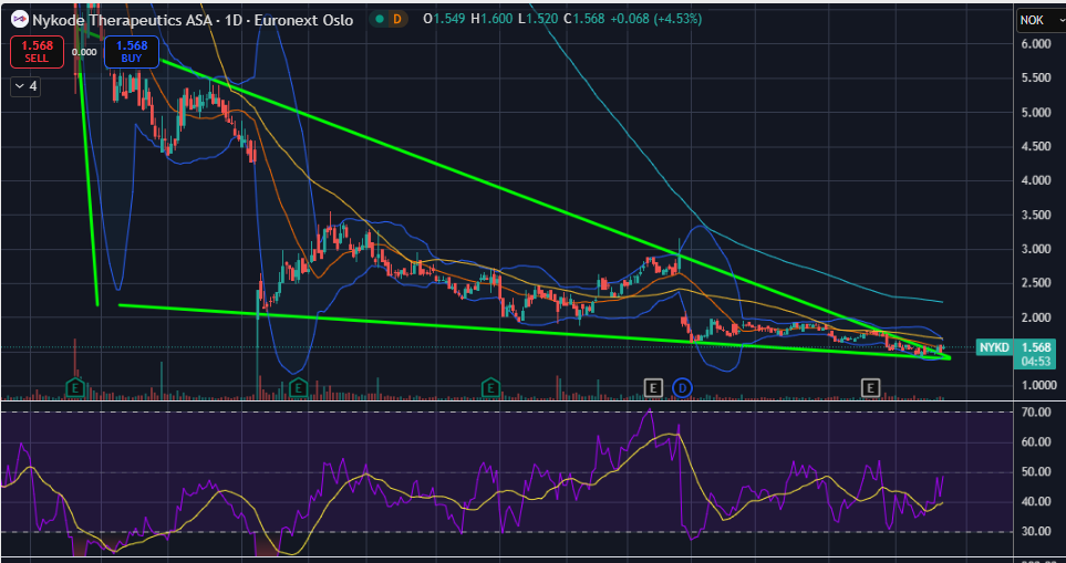 Da har vi i hvert fall brutt ut av formasjonen. Liten IHS på slutten der som også kan være tegn på trendendring. Trenden i RSI bryter også opp nå. Stanger dog litt i 50 dagers glidende for øyeblikket.