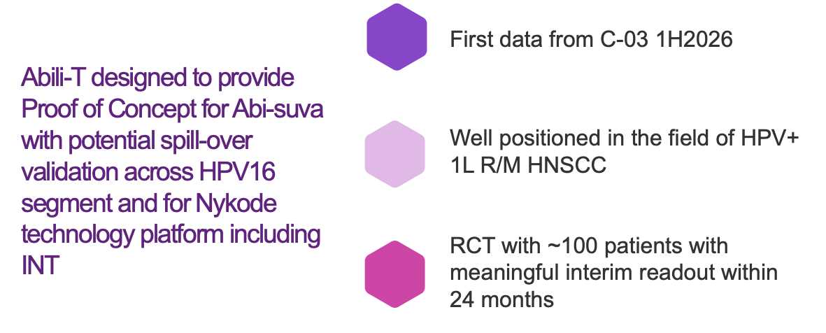 C-03 med 13 pasienter er for lengst rekruttert, er igang (vaksinert) og sikkerhets klarert på alle doser. Interim data (efficacy) best case q1’26. Basis de meget positive indikasjoner de allerede har sett, så kan dette bli mega de-risker for den nye bredere studien. Første mini klinikkstudie på autoimmun (med tier 1 partner om den betaler bra for å få være med) kan også komme allerede q4’25 gitt fremdriften rapportert. På toppen er det opsjonalitet knyttet til Regeneron, ikke umulig at de kommer på banen igjen. Pluss skatte saken.