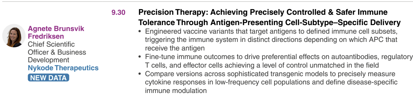 In addition to presenting new data, Nykode will contribute to a scientific panel discussion, highlighting the company’s thought leadership and active engagement within the immune tolerance community.