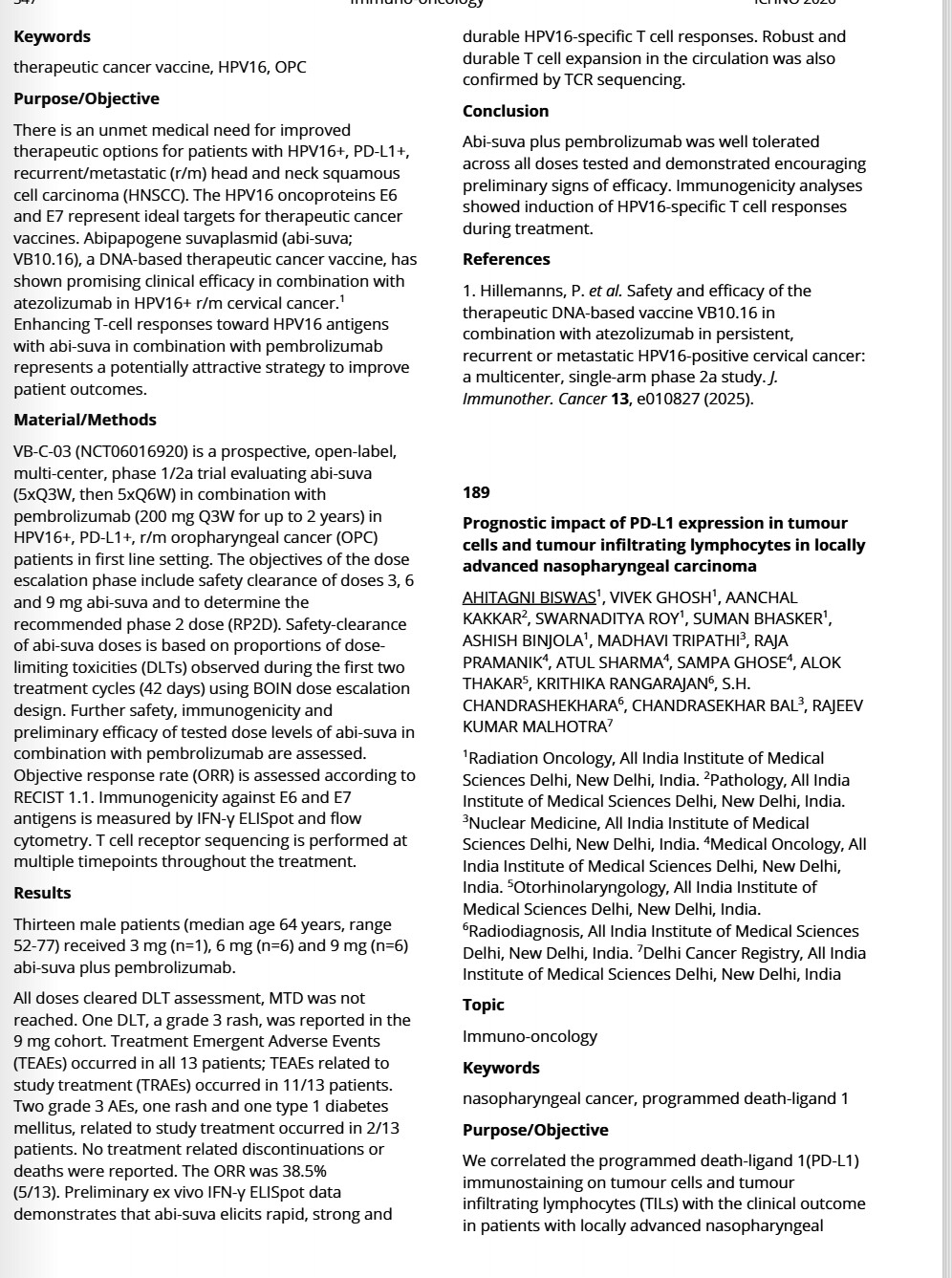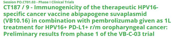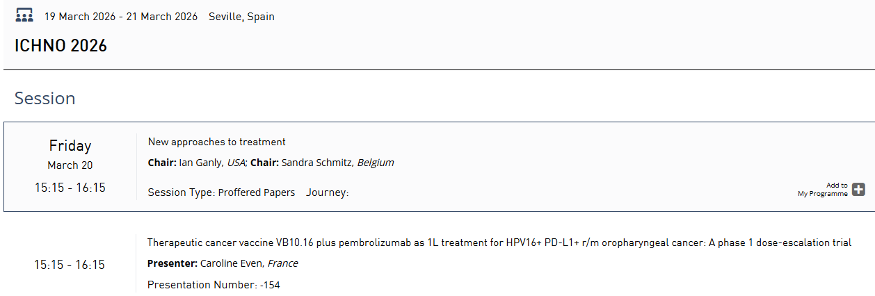 The VB-C-03 trial is investigating abi-suva in combination with MSD’s (Merck & Co., Inc., Rahway, NJ, USA) anti-PD-1 therapy, KEYTRUDA® (pembrolizumab) in first-line unresectable recurrent or metastatic (r/m) oropharyngeal head and neck cancer (OPC) patients (NCT06016920). Nykode is further advancing abi-suva development in first-line r/m OPC through the Abili-T phase 2 randomized clinical trial.