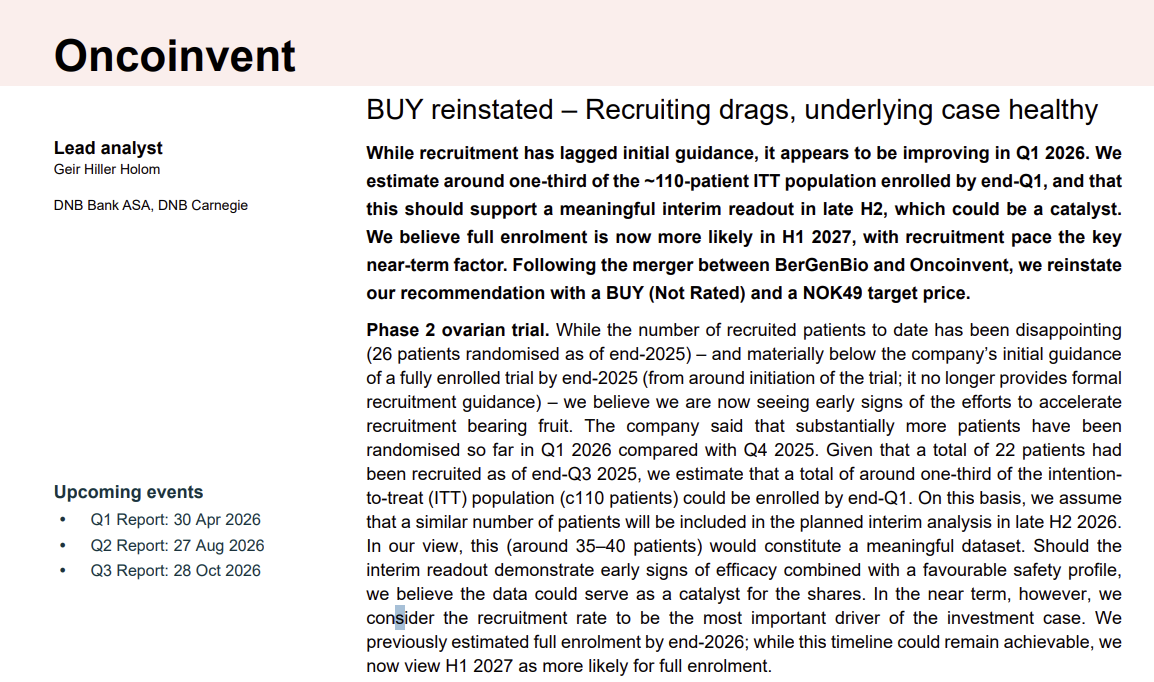 Oncoinvent-aksjen har derimot fått hard medfart, grunnet skuffende rekruttering av pasienter til en viktig studie.