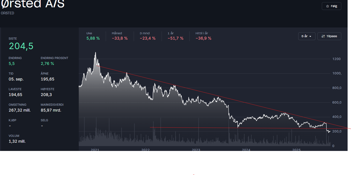 Den 8. januar 2021 stod Ørsted-aksjen i 1351 DKK, nå står den i 178 DKK.