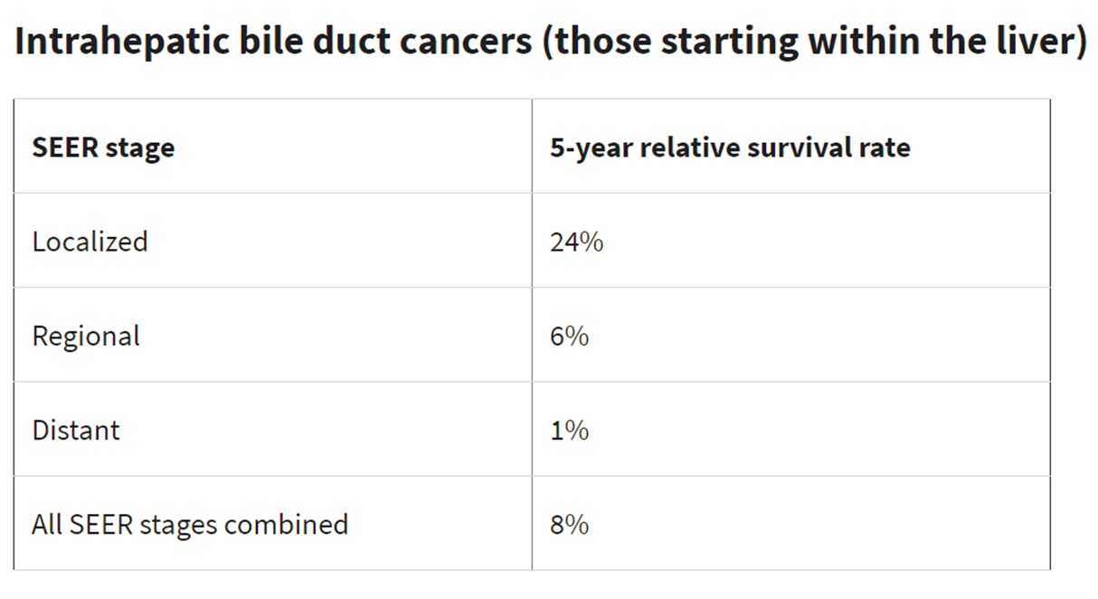 Jeg mener å ha lest her flere ganger at eCCA skal ha dårligere prognose, men jeg kunne ikke finne de resultatene. Det jeg fant fra American Cancer Society var at iCCA hadde ca lik 5 års overlevelse som eCCA (om en litt dårligere), men at det var noen forskjeller mellom iCCA og eCCA på om kreften var lokal, regional eller også distal (som lunger etc.).