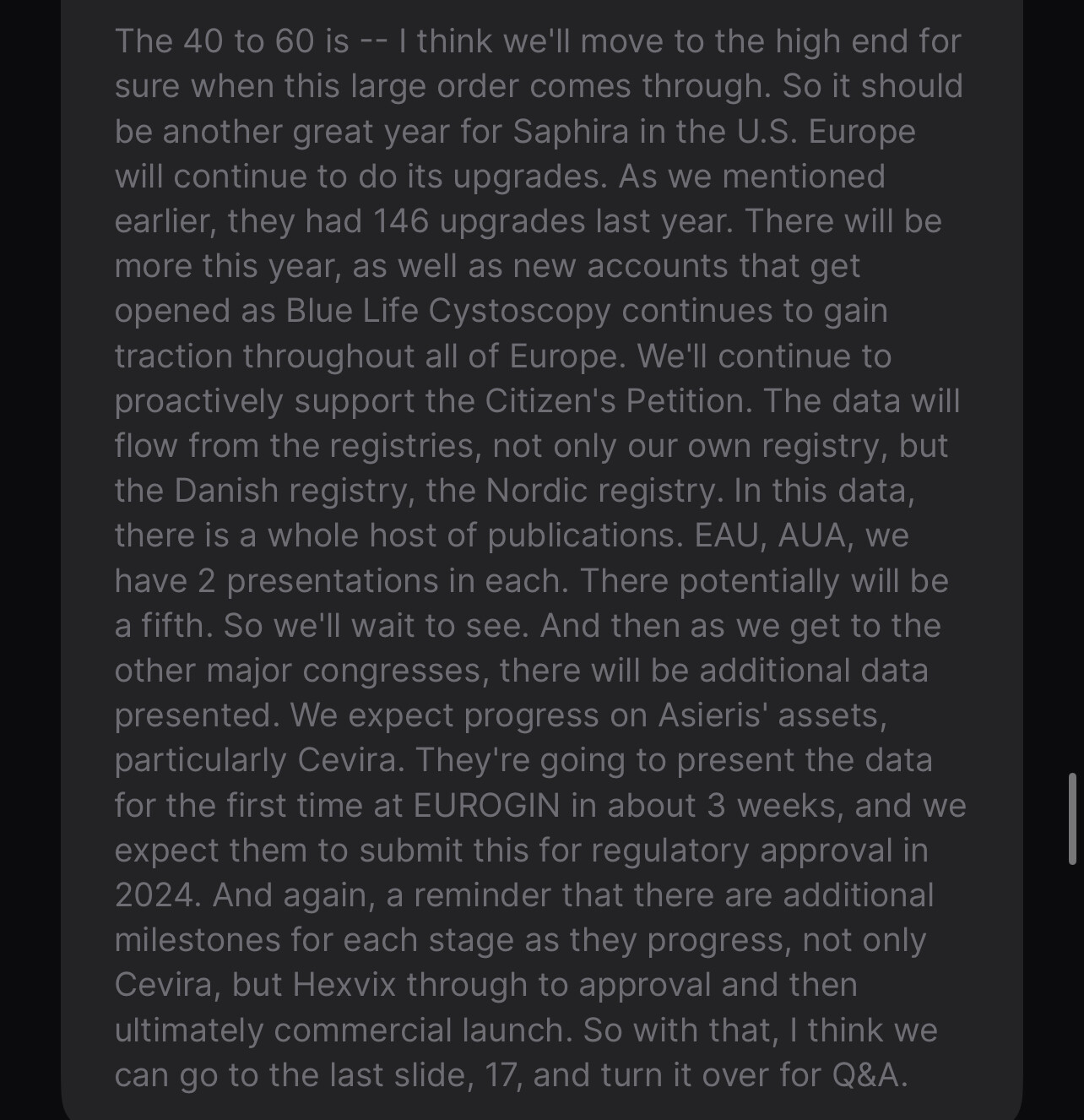 Forventer submit for regulatory approval for Cevira i 2024. Understreker flere milestones både Hexvix og Cevira