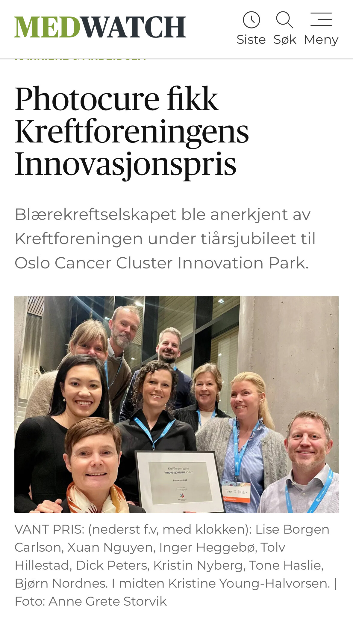Oslo, 28 November 2025 – Photocure is honored to announce that we have been awarded the 2025 Innovation Prize from Kreftforeningen, the Norwegian Cancer Society. The prize provides recognition of our commitment to advancing cancer diagnostics and improving patient outcomes. The award, accompanied by a prize of 300,000 NOK, was presented yesterday, during the 10th anniversary celebration of Oslo Cancer Cluster Innovation Park, following rigorous evaluation by a committee appointed by the Norwegian Cancer Society.