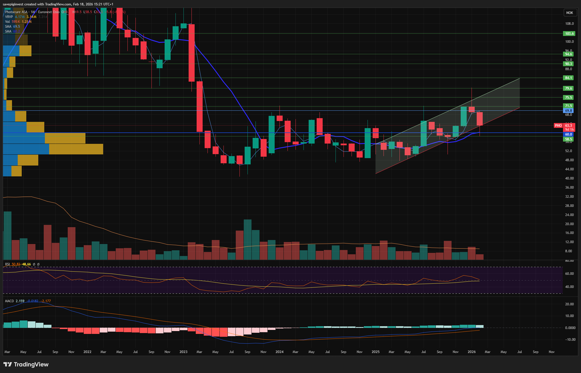 Hvis man nÄ zoomer ut tilbake til i fjor vÄr og setter monthly chart, sÄ begynner jo en trend Ä peke seg ut som har blitt testet bÄde med overshoots og undershoots