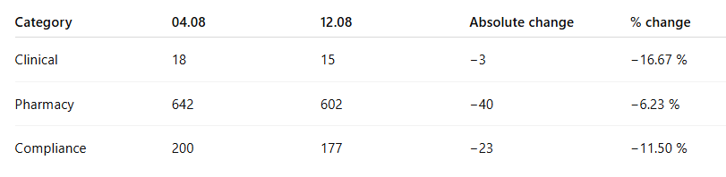 Hvilket valg er dette? Får ikke samme resultat som deg. Ser fortsatt ut som pharmacy er 602, som nevnt 1208.