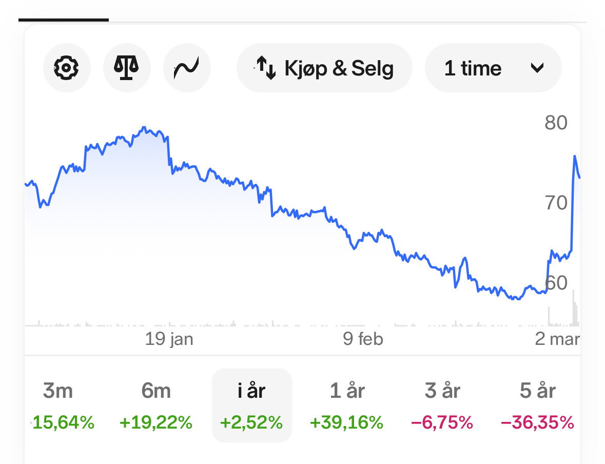 Market cap pÄ kurs 73 er 2 milliarder, sÄ beklager Ä si det, men veldig mye er priset inn allerede av den umiddelbare oppsiden. Men nÄ kan veldig mange fÄ sikret gevinst, og nye som vil sitte for de neste prosentene kan ta deres plass.