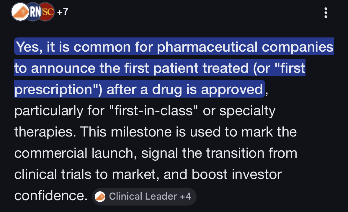 At det ofte (ikke alltid) meldes nÄr fÞrste pasient er dosert i kliniske studier er én ting. At det samme gjÞres for fÞrste behandlede pasient med et godkjent legemiddel har jeg ikke sett.