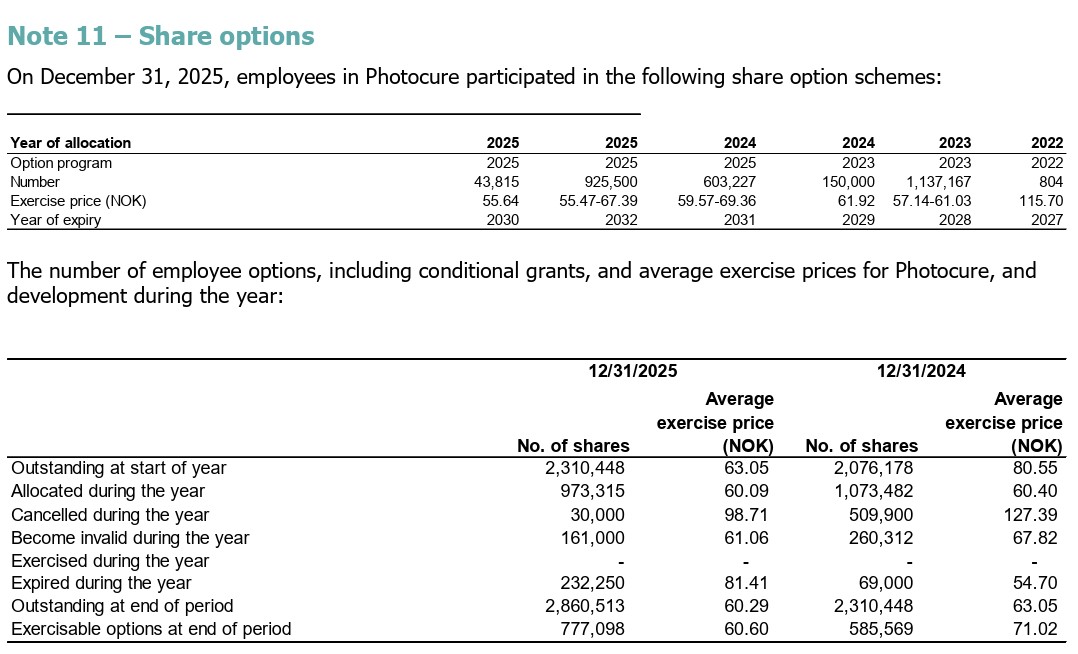 Per i dag er der 2 860 513 utestĂ„ende opsjoner, som tilsvarer 10,55% av antall aksjer i selskapet. Hvis man ser bort fra 804 stk sĂ„ er de aller fleste opsjonene âin the moneyâ allerede med dagens lave kursnivĂ„.